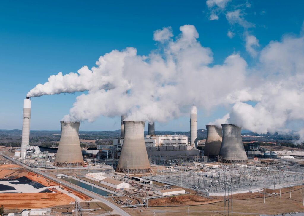 The first picture depicts a large industrial power plant with several cooling towers releasing thick white smoke or steam into the air. The landscape around the facility appears heavily modified: there are roads, electrical infrastructure, and industrial buildings which dominate the area. This setting represents human technological development and large-scale energy production. In contrast, the second picture shows a natural mountainous landscape with a river flowing through a wide valley. The area is covered with forests and vegetation, and there are no visible signs of heavy industry. It conveys a sense of tranquility, biodiversity, and ecological balance.